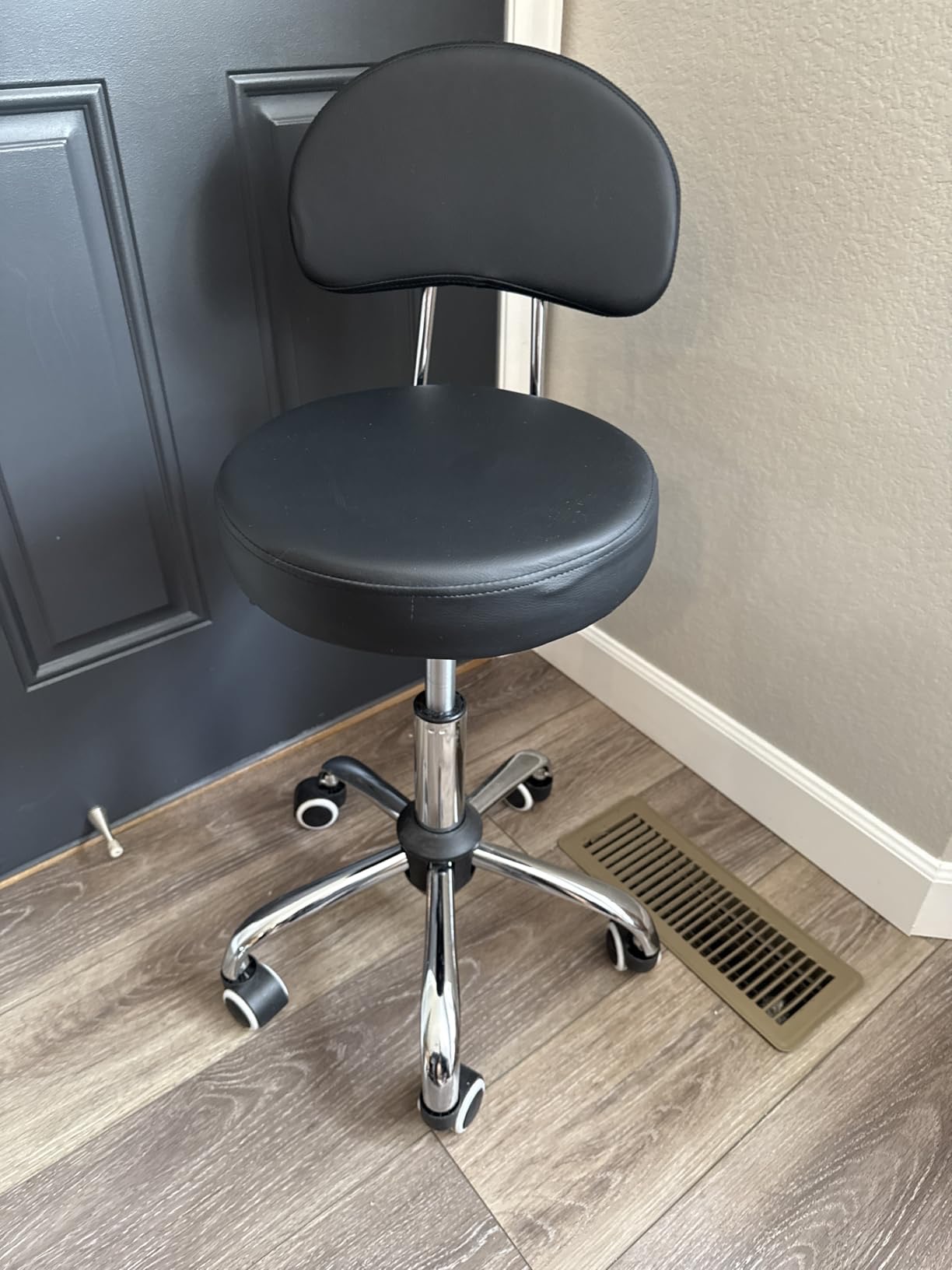 Easy to Assembly:Assembly can be completed in 5 minutes. Holds up to: 300 lbs. The Rolling Stools ideals for Bars, Pubs,Office,Shops,Home,Work,Salon,Spa,Tattoo,Facial,Kitchen,Massage,etc. 360 Swivel Casters: easy to roll on hard floor & safe for soft floor. Comfortable drafting chair:The salon stool equipped with a modern round cushioned seat, low backrest for better back support,PU leather waterproof, easy to clean and maintain. Height adjustable stool: The height of the stool can be adjusted from 18.9" to 25 " by using the adjusting handle. Seat diameter: 12.6" , Backrest height: 10.4 ".